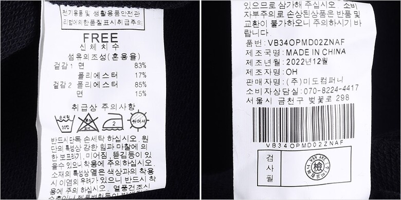 1. 제품 소재 (섬유의 조성 또는 혼용률을 백분율로 표시, 기능성인 경우 성적서 또는 허가서) | 겉감-면83% 폴리에스터17% 겉감2-면85% 면15% |