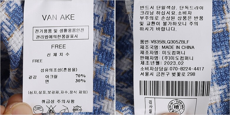 1. 제품 소재 (섬유의 조성 또는 혼용률을 백분율로 표시, 기능성인 경우 성적서 또는 허가서) | 겉감-면30% 아크릴70% |