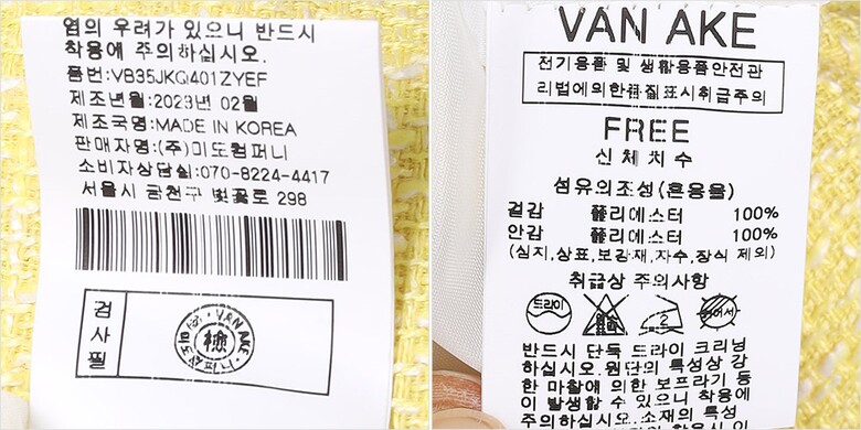 | 1. 제품 소재 (섬유의 조성 또는 혼용률을 백분율로 표시, 기능성인 경우 성적서 또는 허가서) | 겉감-폴리에스터100% 안감-폴리에스터100% |
