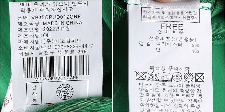 | 1. 제품 소재 (섬유의 조성 또는 혼용률을 백분율로 표시, 기능성인 경우 성적서 또는 허가서) | 겉감-면10% 폴리에스터90% |