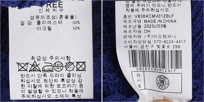 1. 제품 소재 (섬유의 조성 또는 혼용률을 백분율로 표시, 기능성인 경우 성적서 또는 허가서) 겉감-폴리에스터50% 아크릴50%