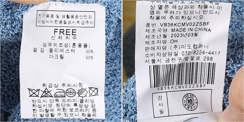 | 1. 제품 소재 (섬유의 조성 또는 혼용률을 백분율로 표시, 기능성인 경우 성적서 또는 허가서) | 겉감-폴리에스터50% 아크릴50% |