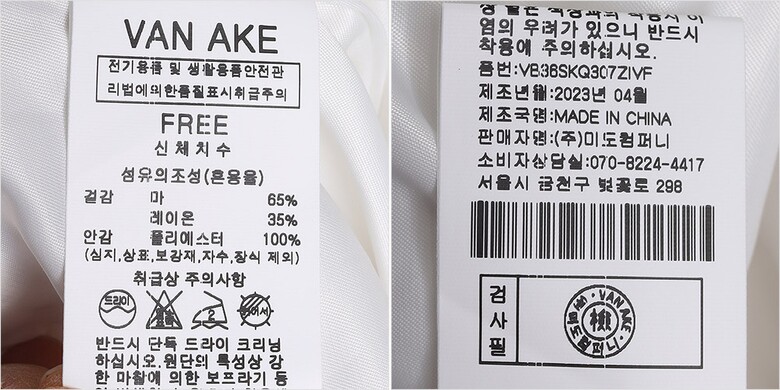 | 1. 제품 소재 (섬유의 조성 또는 혼용률을 백분율로 표시, 기능성인 경우 성적서 또는 허가서) | 겉감-레이온35% 마65% 안감-폴리에스터100% |