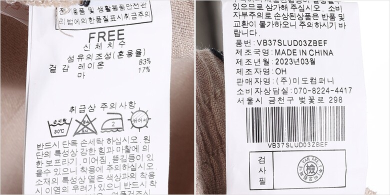| 1. 제품 소재 (섬유의 조성 또는 혼용률을 백분율로 표시, 기능성인 경우 성적서 또는 허가서) | 겉감-레이온83% 마17% |