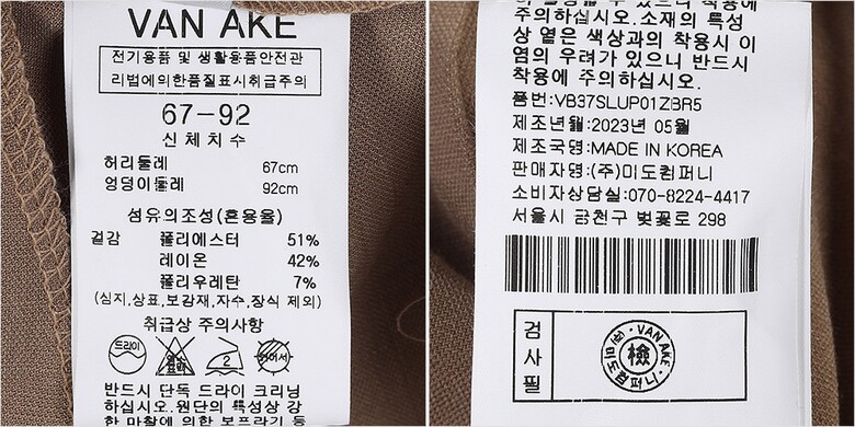 | 1. 제품 소재 (섬유의 조성 또는 혼용률을 백분율로 표시, 기능성인 경우 성적서 또는 허가서) | 겉감-폴리에스터51% 폴리우레탄7% 레이온42% |