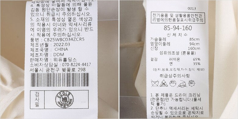 | 6. 세탁방법 및 취급시 주의사항 | 상세페이지 참조 |