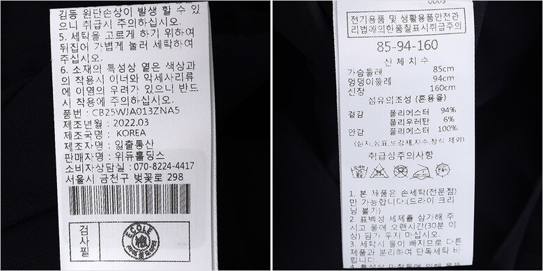 | 1. 제품 소재 (섬유의 조성 또는 혼용률을 백분율로 표시, 기능성인 경우 성적서 또는 허가서) | 겉감-폴리에스터94% 폴리우레탄6% 안감-폴리에스터100% |