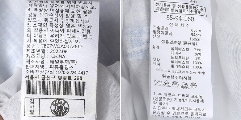 | 1. 제품 소재 (섬유의 조성 또는 혼용률을 백분율로 표시, 기능성인 경우 성적서 또는 허가서) | 겉감-폴리에스터73% 폴리우레탄1% 레이온26% 안감-폴리에스터100% 배색-폴리에스터100% |