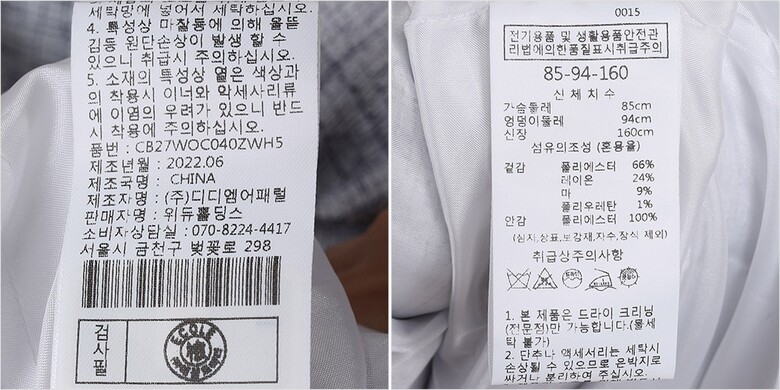 | 1. 제품 소재 (섬유의 조성 또는 혼용률을 백분율로 표시, 기능성인 경우 성적서 또는 허가서) | 겉감-폴리에스터66% 폴리우레탄1% 레이온24% 마9% 안감-폴리에스터100% |