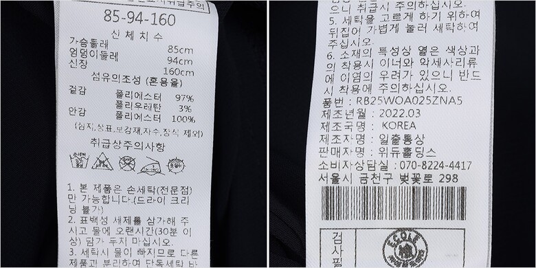 | 1. 제품 소재 (섬유의 조성 또는 혼용률을 백분율로 표시, 기능성인 경우 성적서 또는 허가서) | 겉감-폴리에스터97% 폴리우레탄3% 안감-폴리에스터100% |