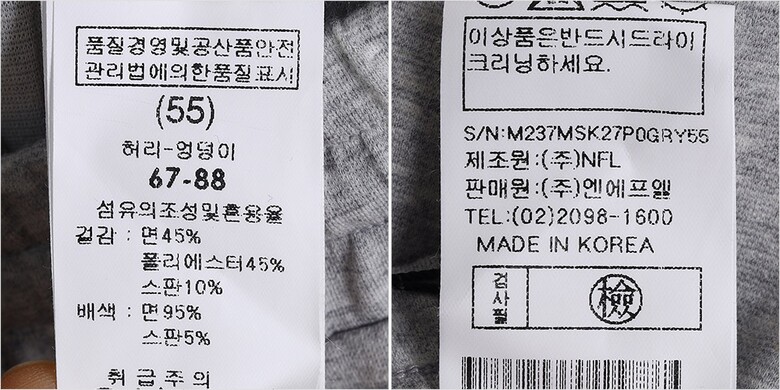 1. 제품 소재 (섬유의 조성 또는 혼용률을 백분율로 표시, 기능성인 경우 성적서 또는 허가서) 겉감-면45% 폴리에스터45% 스판10% 배색-면95%스판5%