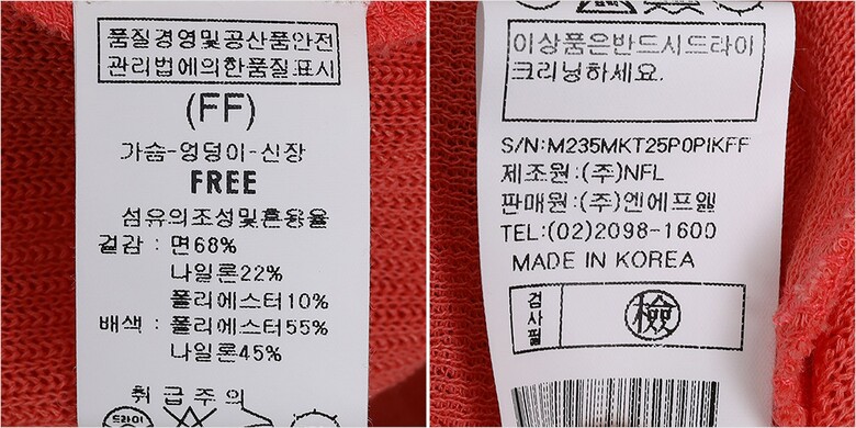 1. 제품 소재 (섬유의 조성 또는 혼용률을 백분율로 표시, 기능성인 경우 성적서 또는 허가서) | 겉감-면68% 폴리에스터10% 나일론22% 배색-폴리에스터55% 나일론45% |