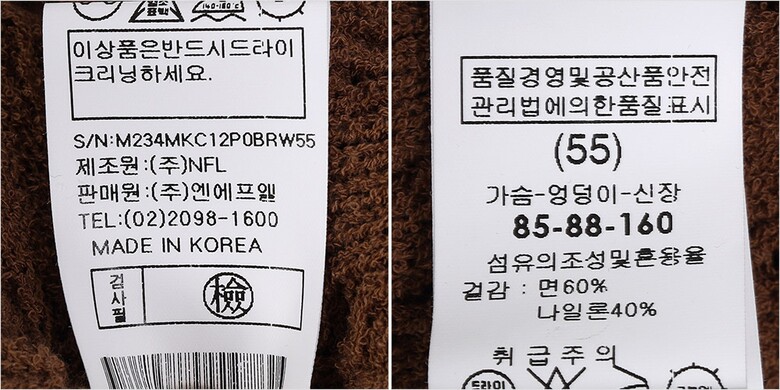 | 1. 제품 소재 (섬유의 조성 또는 혼용률을 백분율로 표시, 기능성인 경우 성적서 또는 허가서) | 겉감-면60% 나일론40% |