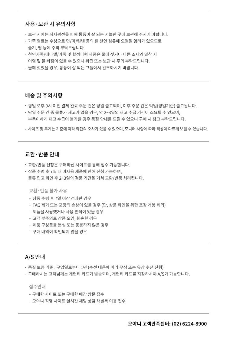 • 처음 배송된 상품상태와 다를 경우(세탁/착용 후 외출하신 경우) 반품이 불가합니다.
