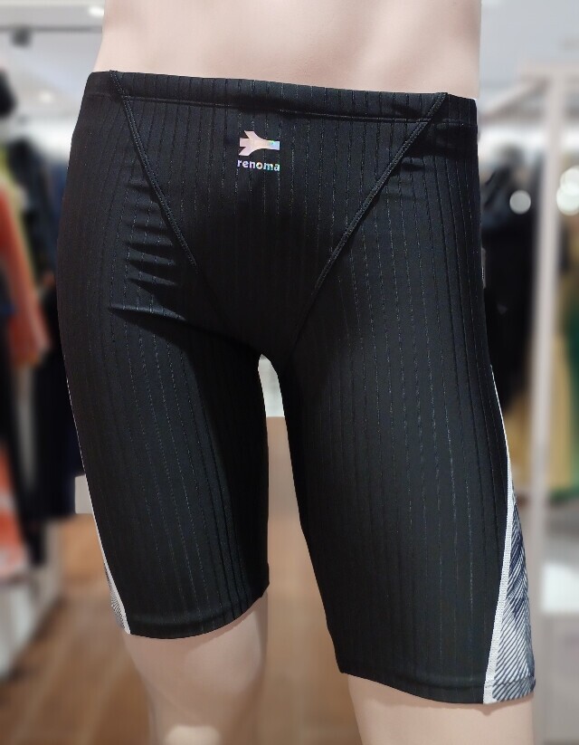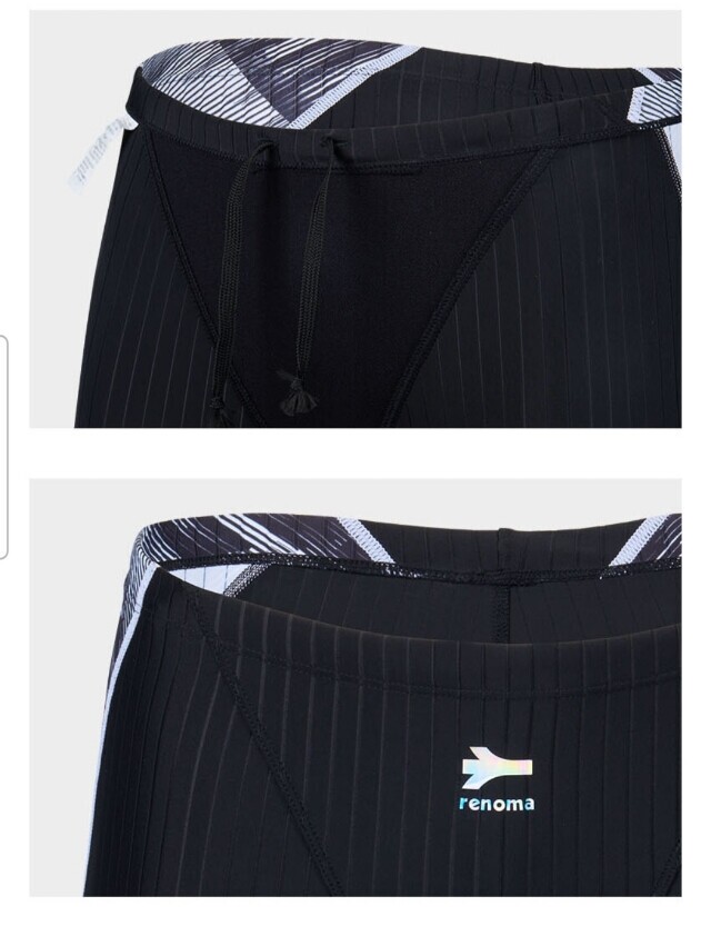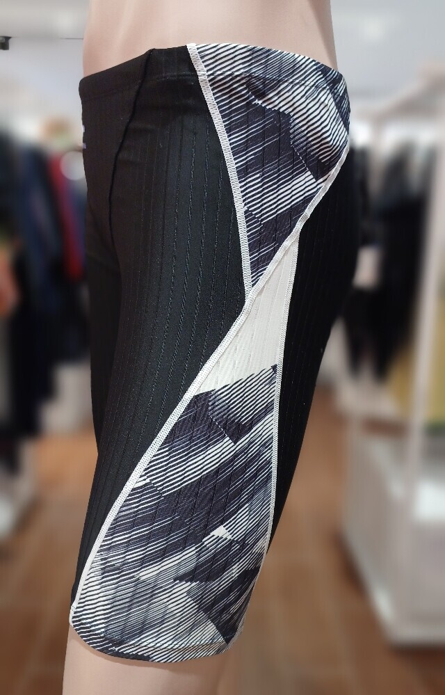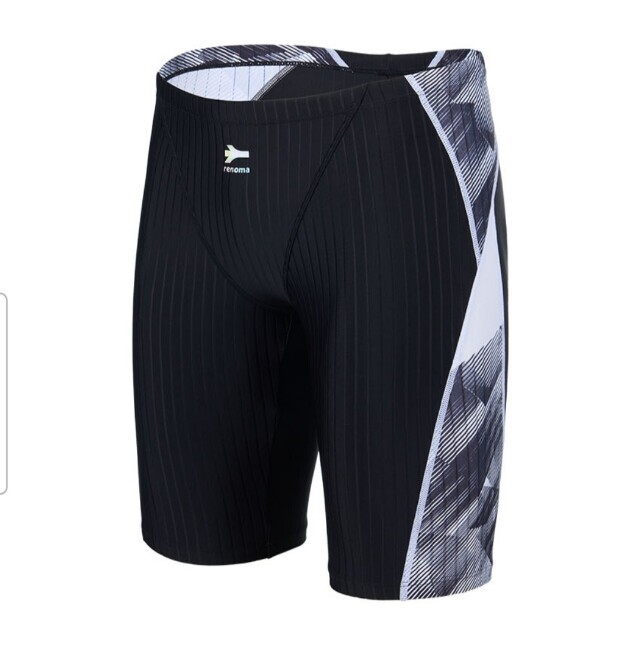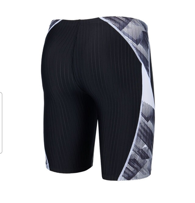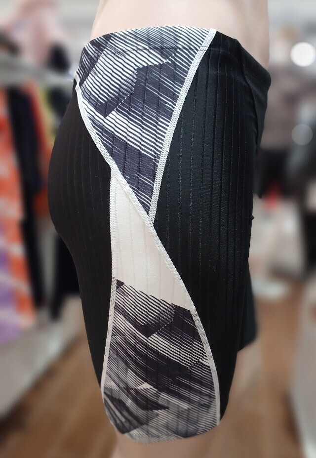 액티브한 기하학 프린트를 사선 배치 오드랄프 라인으로 슬림해 보이며 골지 원단을 사용한 남성 4부 실내수영복입니다.