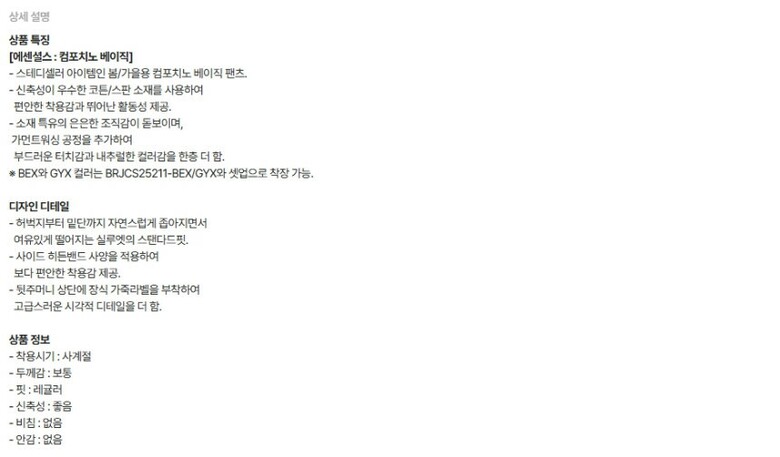 | 1. 제품 소재 (섬유의 조성 또는 혼용률을 백분율로 표시, 기능성인 경우 성적서 또는 허가서) | 상품상세참조 |