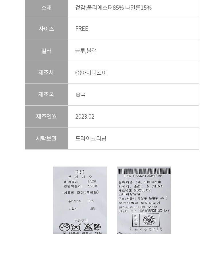 1. 제품 소재 (섬유의 조성 또는 혼용률을 백분율로 표시, 기능성인 경우 성적서 또는 허가서) | 상세페이지 참조 |