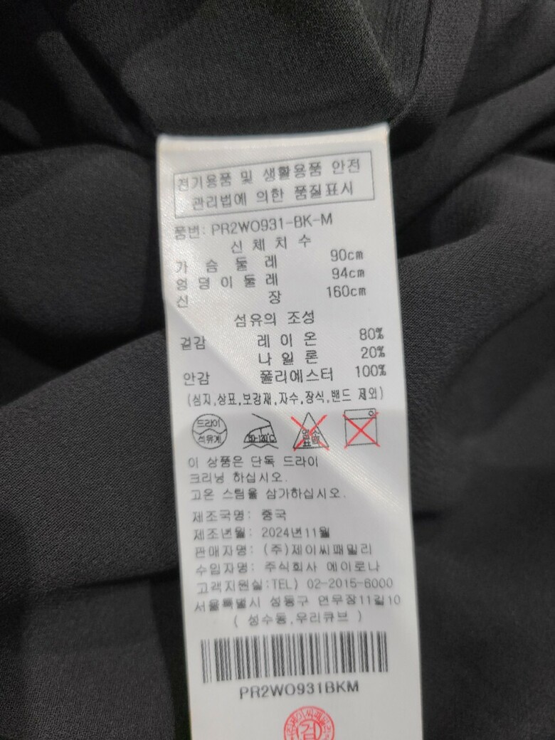 | 1. 제품 소재 (섬유의 조성 또는 혼용률을 백분율로 표시, 기능성인 경우 성적서 또는 허가서) | 폴리에스테르 69%, 레이온 25%, 폴리우레탄 6% |
