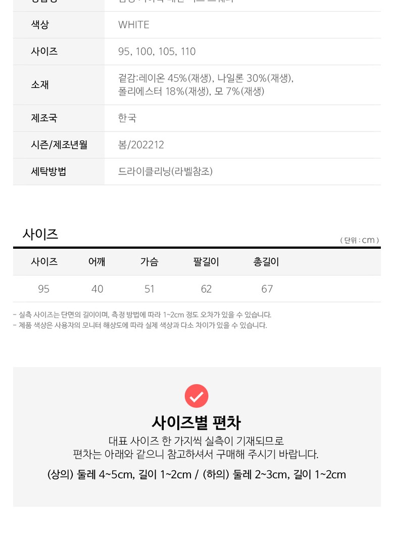 3. 치수 95사이즈기준실측 : 어깨40cm, 가슴51cm, 팔길이62cm, 총길이67cm