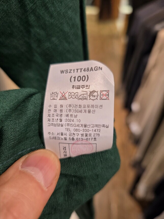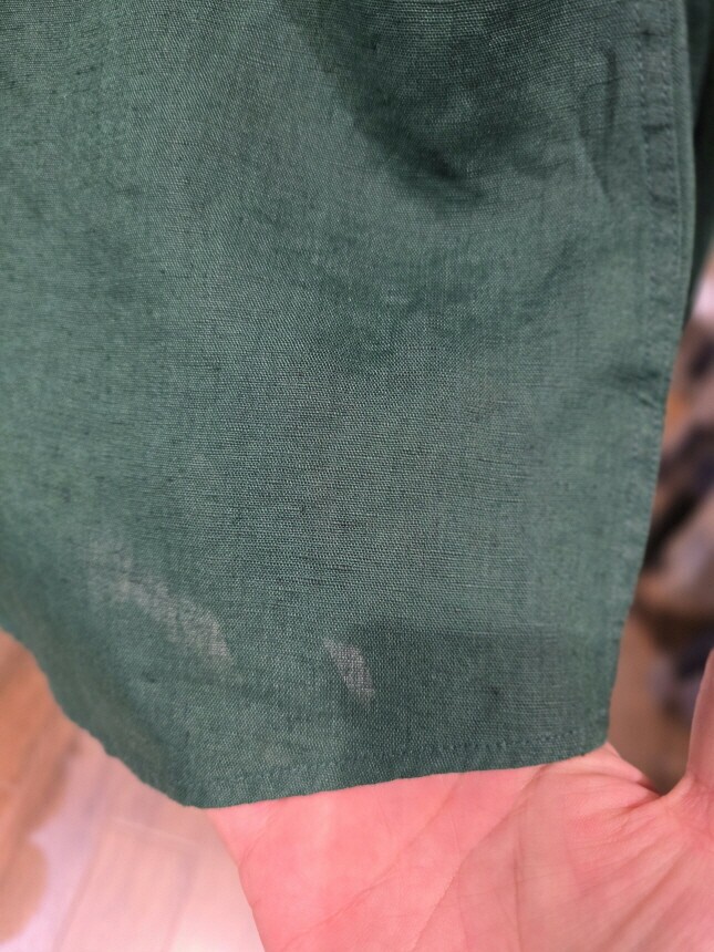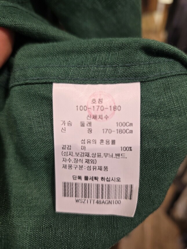 | 1. 제품 소재 (섬유의 조성 또는 혼용률을 백분율로 표시, 기능성인 경우 성적서 또는 허가서) | 겉감 : 마 100% (심지,보강재.상표,무늬,밴드,자수,장식 제외) |