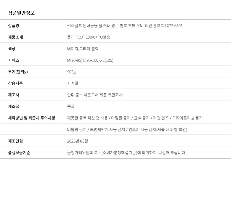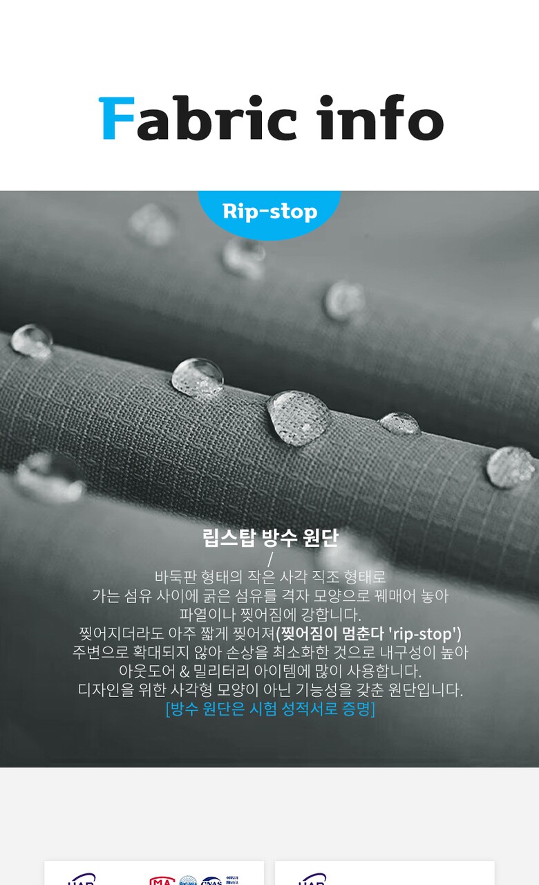 1. 제품 소재 (섬유의 조성 또는 혼용률을 백분율로 표시, 기능성인 경우 성적서 또는 허가서) 폴리에스터100%+PU코팅