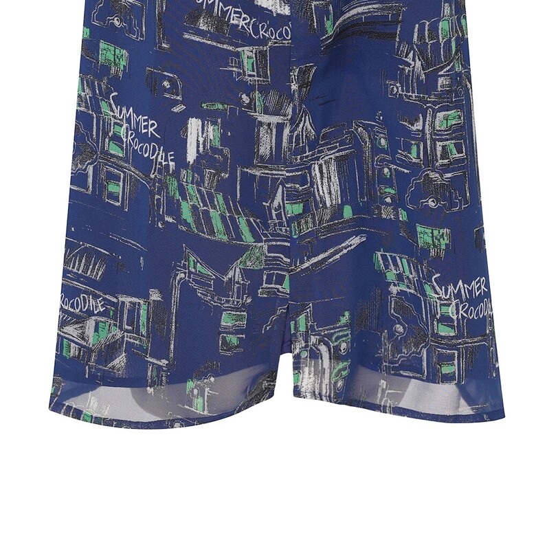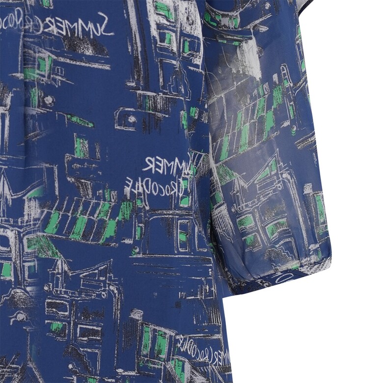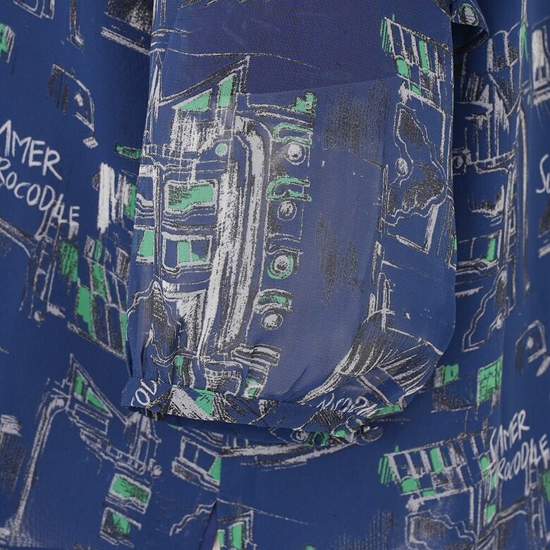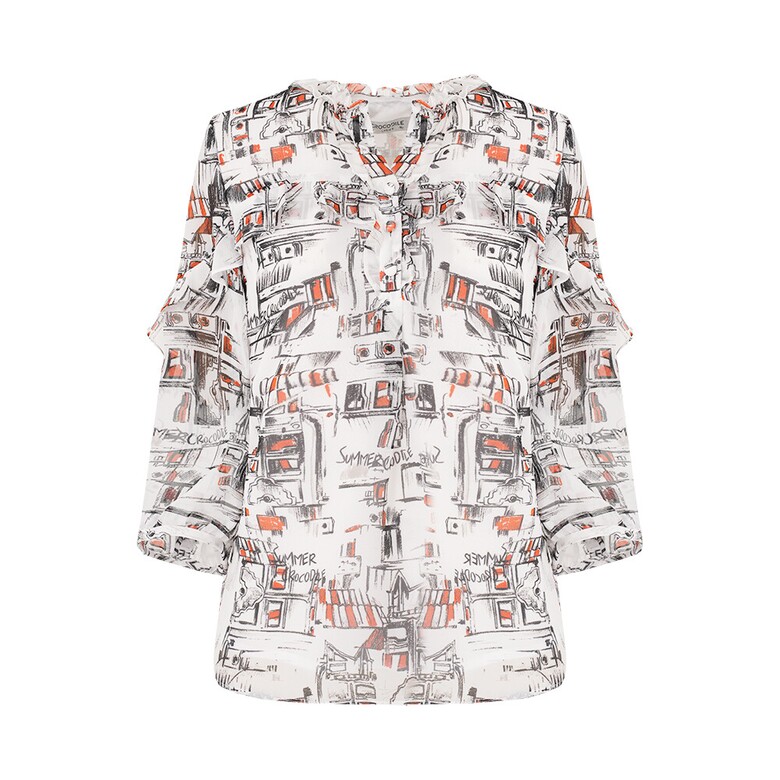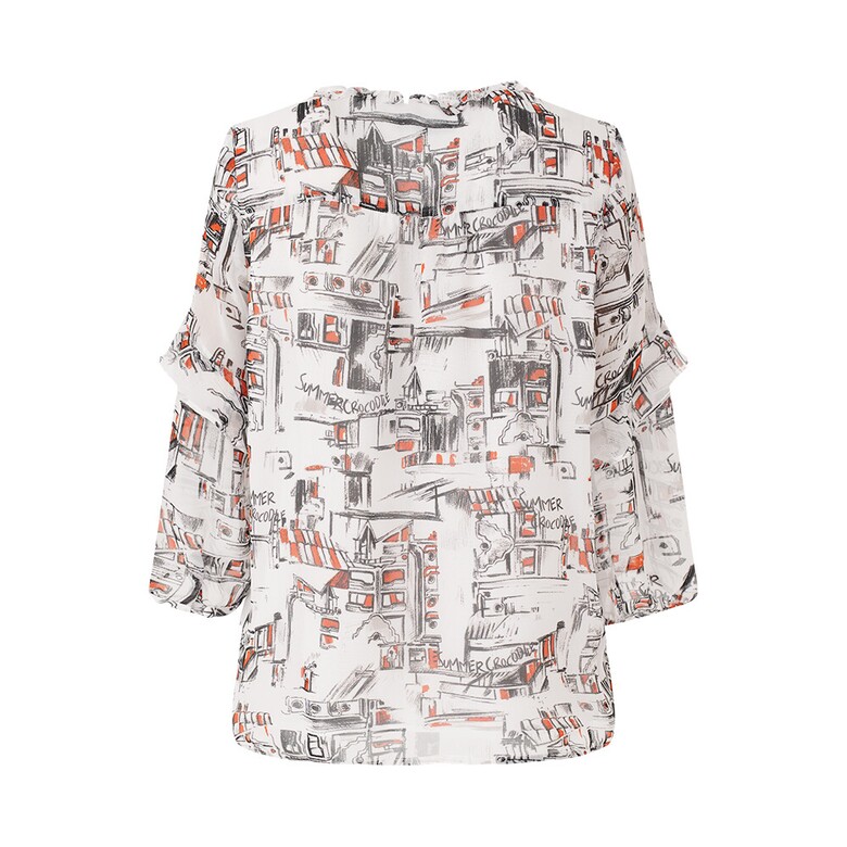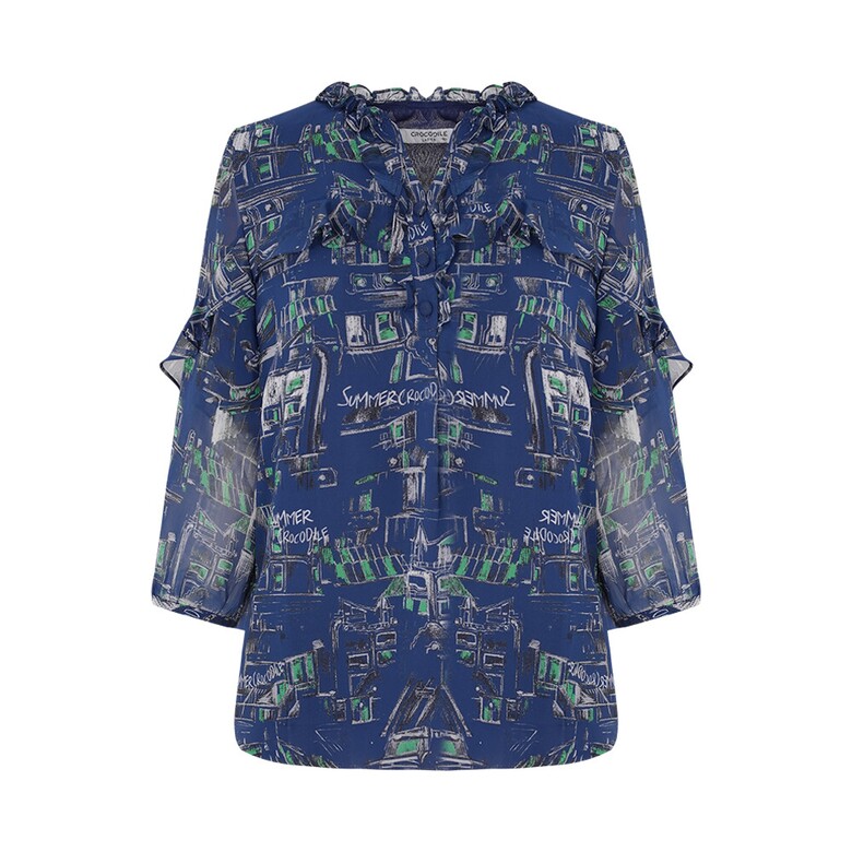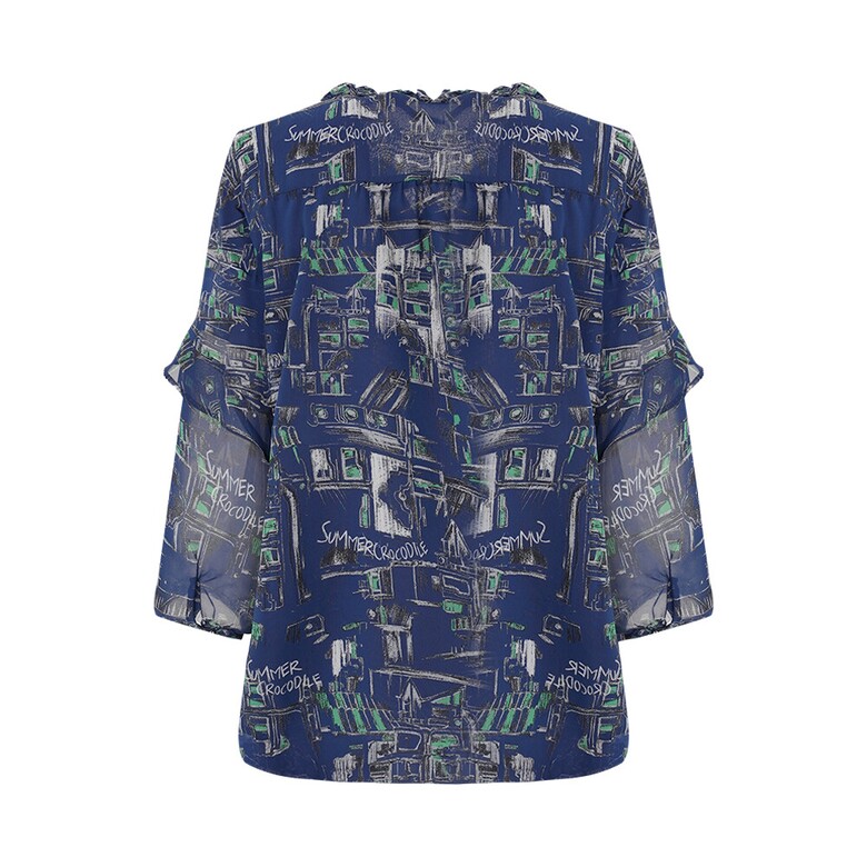 상동소매에 제원단 프릴을 끼워물린 여성스러운 프린트 블라우스