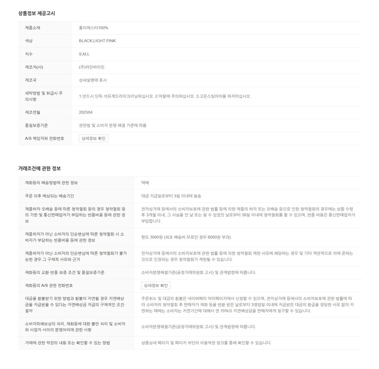 | 6. 세탁방법 및 취급시 주의사항 | 상품상세참조 |