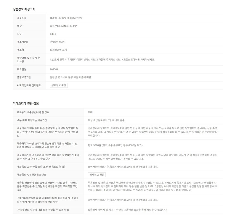 | 6. 세탁방법 및 취급시 주의사항 | 상품상세참조 |