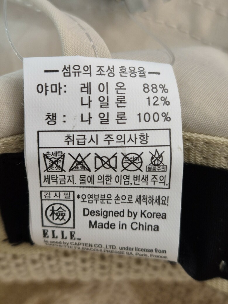 | 2. 소재 | 야마:레이온88%,나일론12%, 챙:나일론 100% |