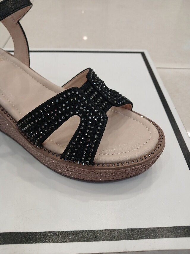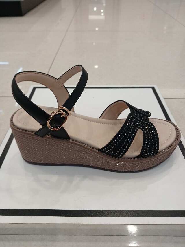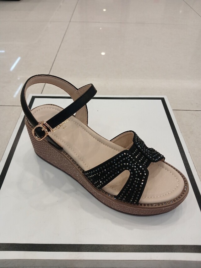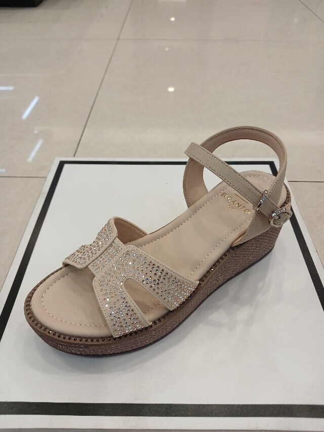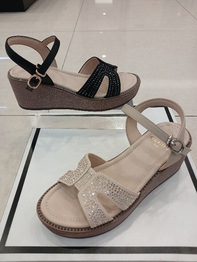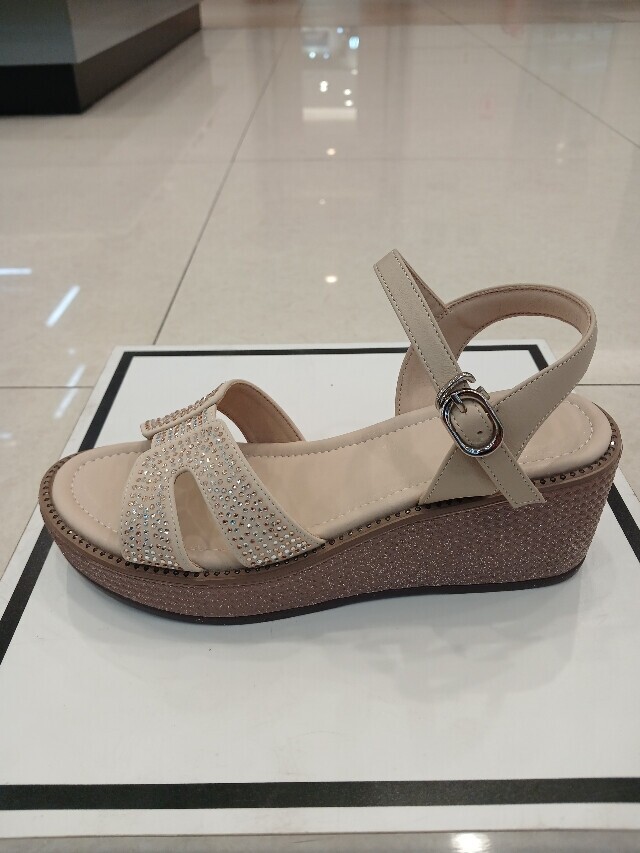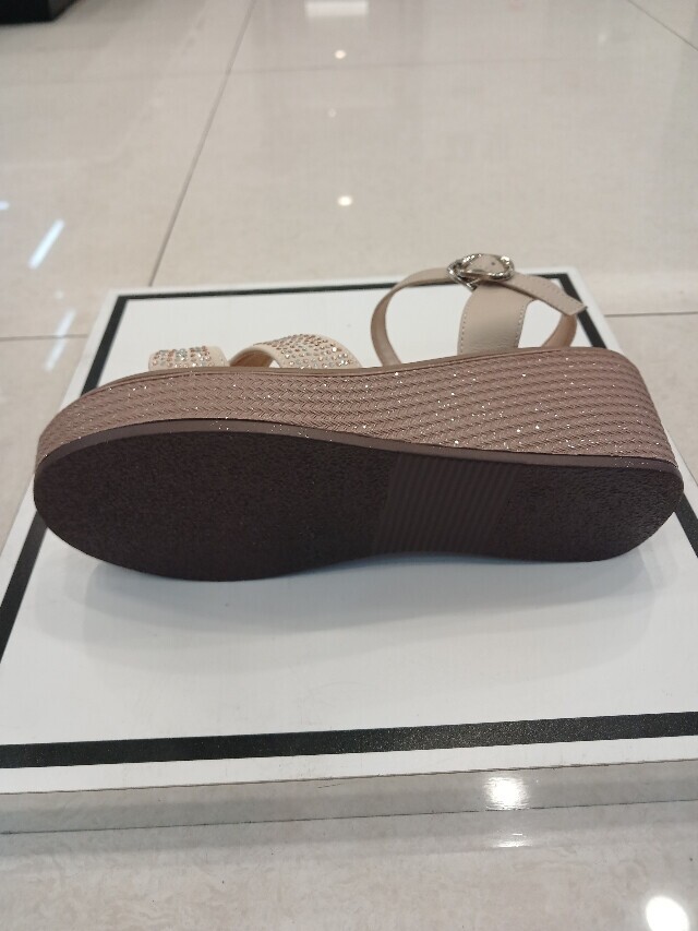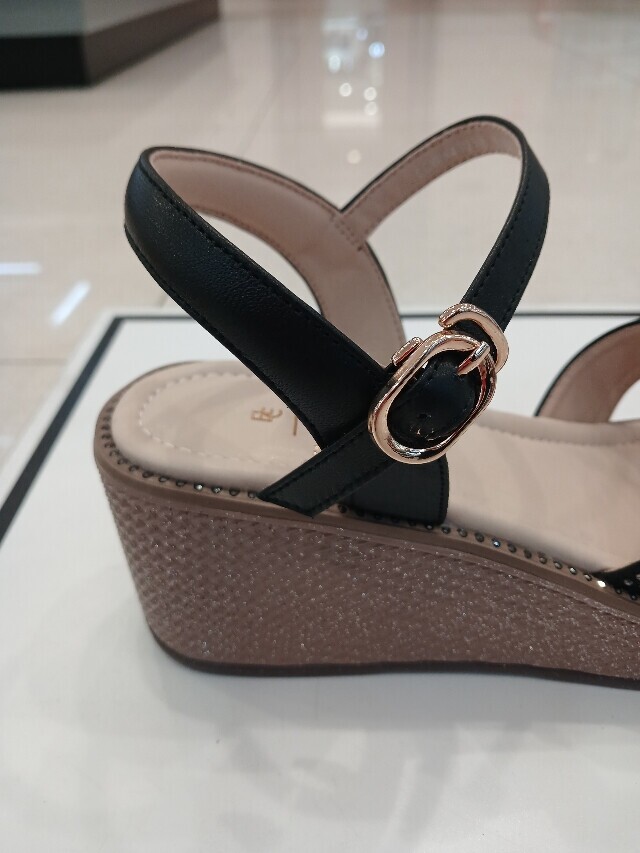 굽높이 약6cm의 높이에 양가죽40%와 패브릭60% 소재를 사용하여 제작된 여성 웨지샌들상품입니다