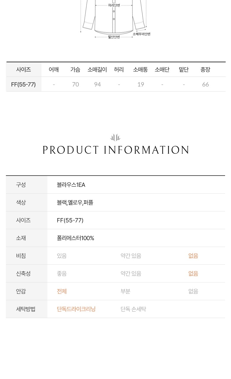 1. 제품 소재 (섬유의 조성 또는 혼용률을 백분율로 표시, 기능성인 경우 성적서 또는 허가서) | 폴리에스터100% |