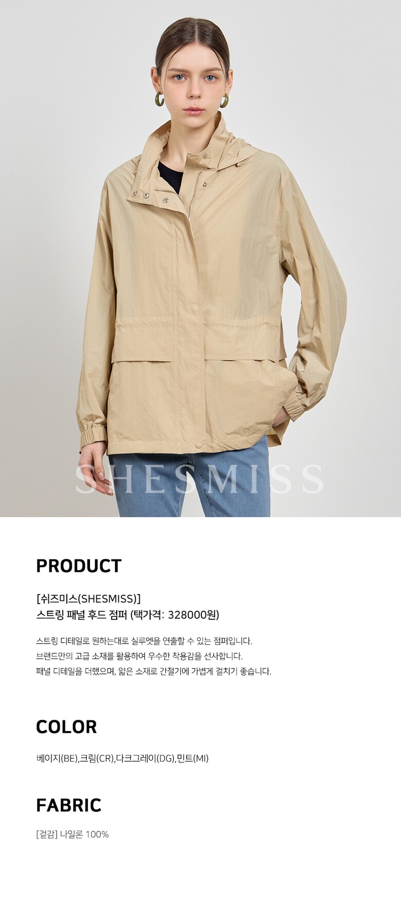 [쉬즈미스(SHESMISS)] 나일론100소재 스트링 패널 후드 점퍼 (택가격: 328000원)