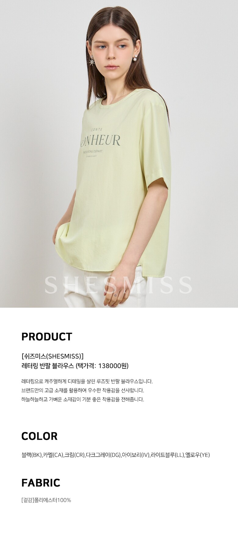[쉬즈미스(SHESMISS)] 싱그러운 레터링 반소매 블라우스 (택가격: 138000원)