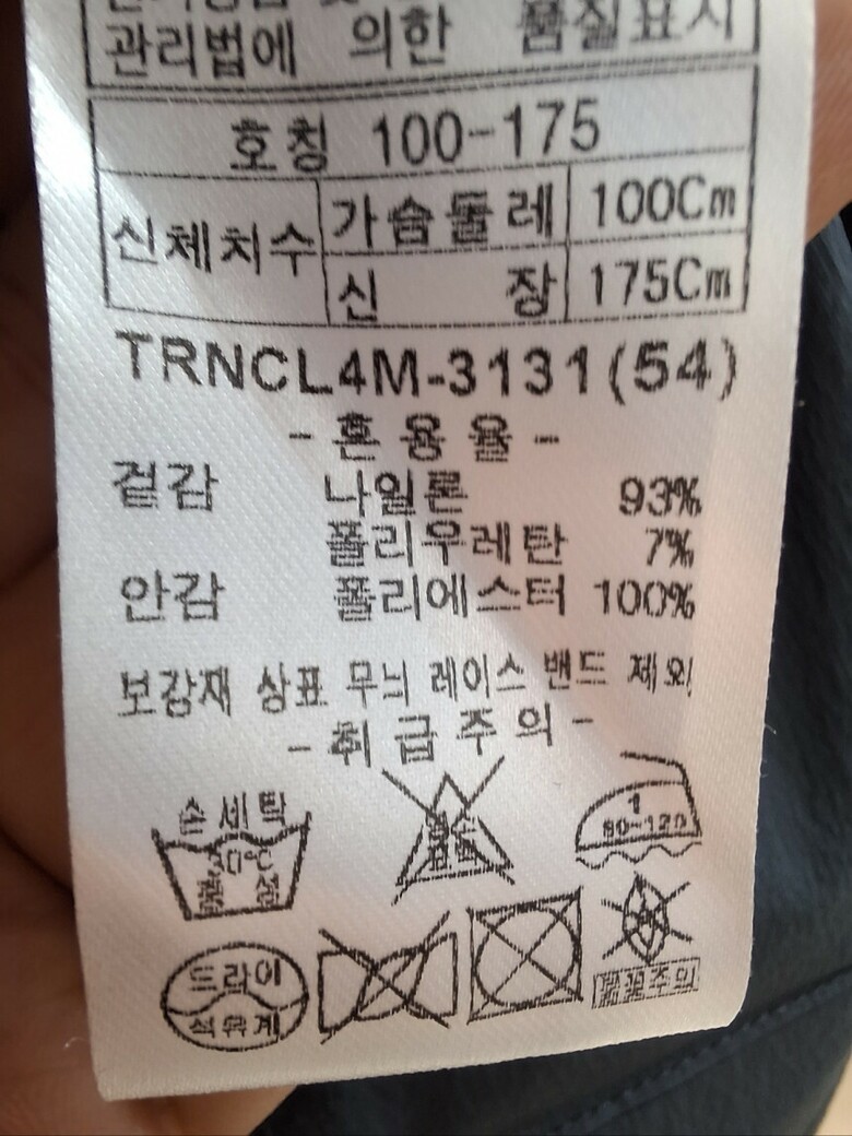 | 1. 제품 소재 (섬유의 조성 또는 혼용률을 백분율로 표시, 기능성인 경우 성적서 또는 허가서) | 겉감:나일론 93%, 폴리우레탄 7% / 안감:폴리에스테르 100% |