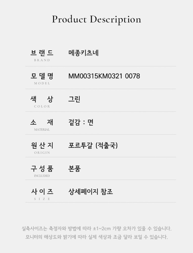 | 1. 제품 소재 (섬유의 조성 또는 혼용률을 백분율로 표시, 기능성인 경우 성적서 또는 허가서) | 상세페이지 참조 |