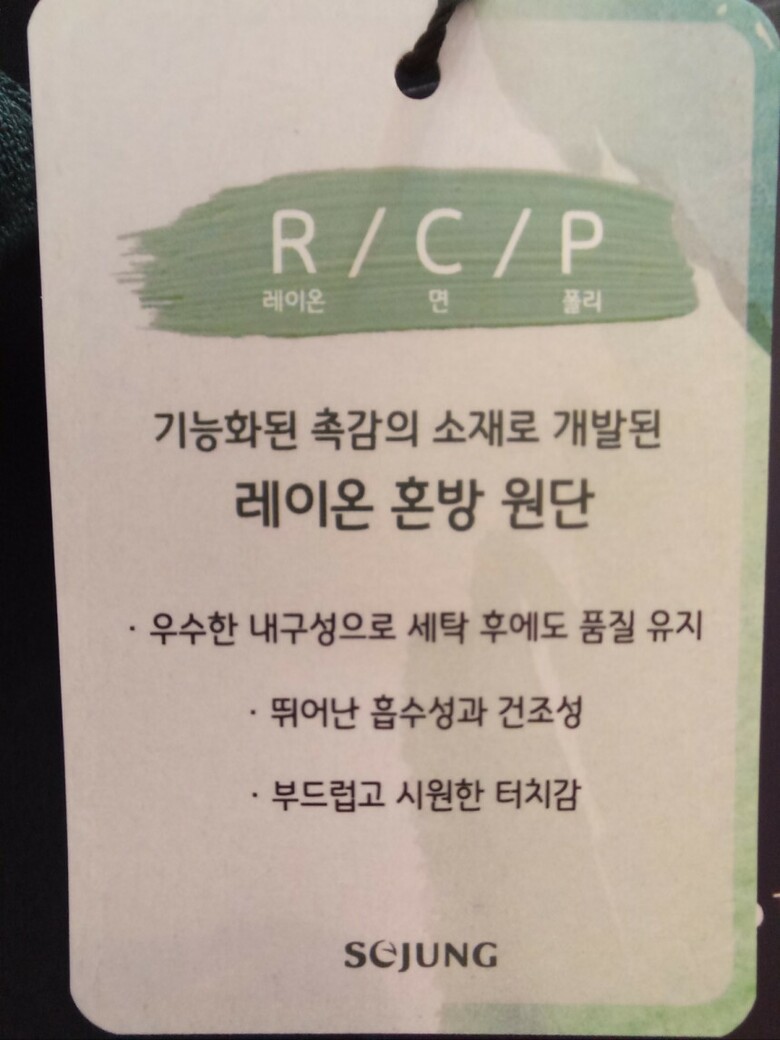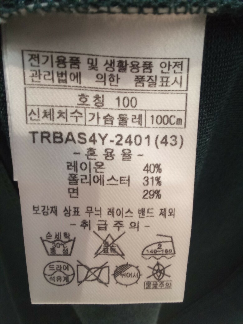 | 1. 제품 소재 (섬유의 조성 또는 혼용률을 백분율로 표시, 기능성인 경우 성적서 또는 허가서) | 레이온 40%, 폴리에스테르 31%, 면 29% |