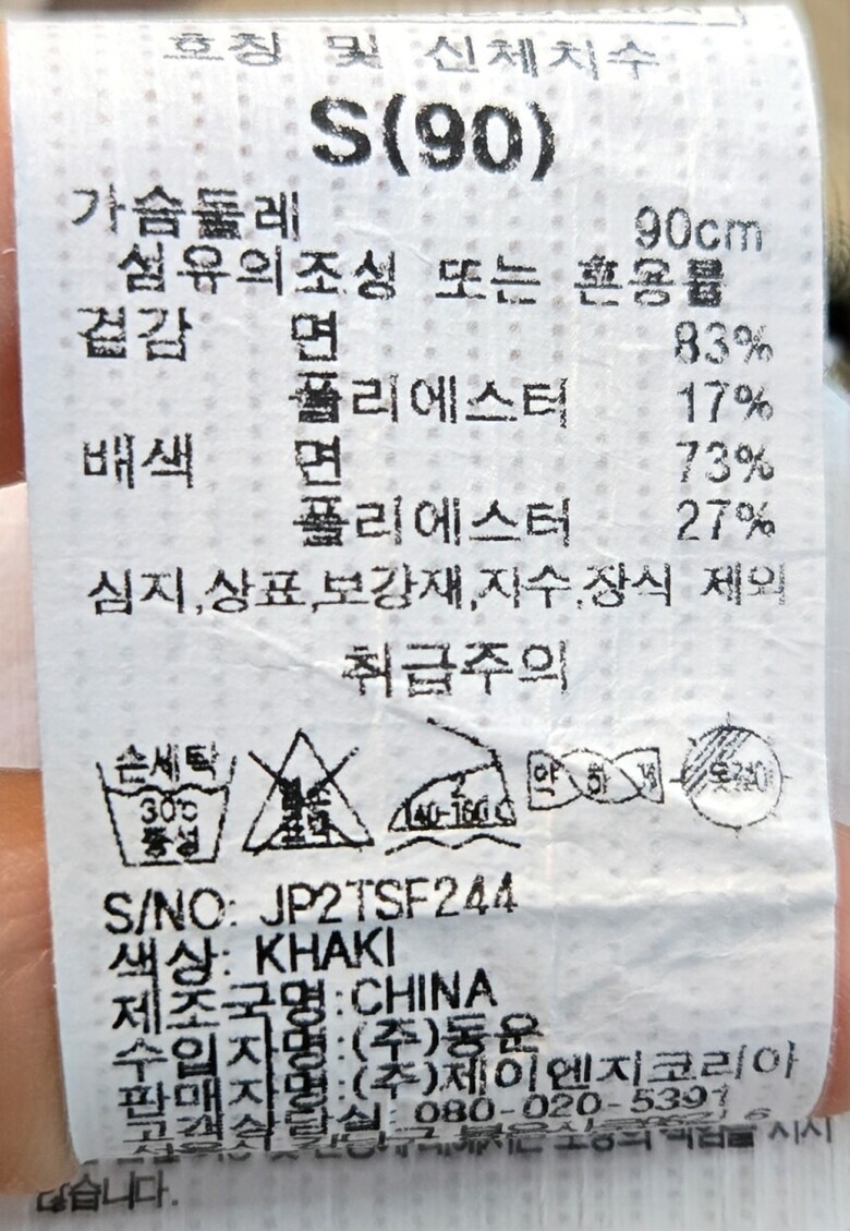 | 1. 제품 소재 (섬유의 조성 또는 혼용률을 백분율로 표시, 기능성인 경우 성적서 또는 허가서) | 겉감:면 100%/배색:면 95%, 폴리우레탄 5% |