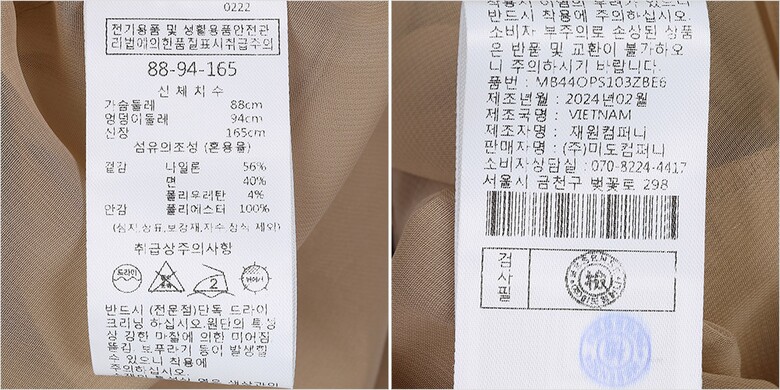1. 제품 소재 (섬유의 조성 또는 혼용률을 백분율로 표시, 기능성인 경우 성적서 또는 허가서) 겉감-면40% 폴리우레탄4% 나일론56% 안감-폴리에스터100%