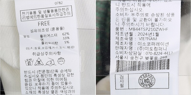 1. 제품 소재 (섬유의 조성 또는 혼용률을 백분율로 표시, 기능성인 경우 성적서 또는 허가서) 겉감-면33% 폴리에스터62% 폴리우레탄5%