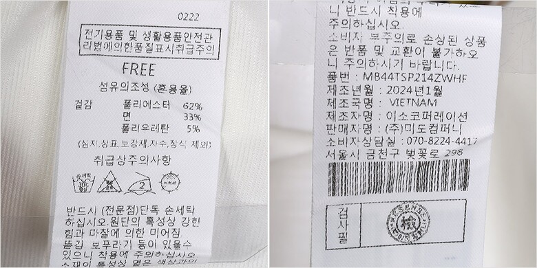 | 1. 제품 소재 (섬유의 조성 또는 혼용률을 백분율로 표시, 기능성인 경우 성적서 또는 허가서) | 겉감-면33% 폴리에스터62% 폴리우레탄5% |