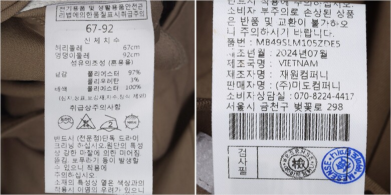 | 1. 제품 소재 (섬유의 조성 또는 혼용률을 백분율로 표시, 기능성인 경우 성적서 또는 허가서) | 겉감-폴리에스터97% 폴리우레탄3% 배색-폴리에스터100% |