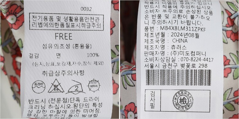 | 1. 제품 소재 (섬유의 조성 또는 혼용률을 백분율로 표시, 기능성인 경우 성적서 또는 허가서) | 겉감-면100% |