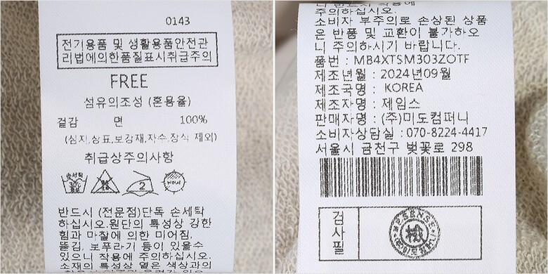 | 1. 제품 소재 (섬유의 조성 또는 혼용률을 백분율로 표시, 기능성인 경우 성적서 또는 허가서) | 겉감-면100% |