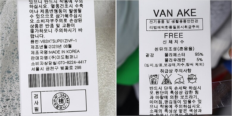 1. 제품 소재 (섬유의 조성 또는 혼용률을 백분율로 표시, 기능성인 경우 성적서 또는 허가서) 겉감-폴리에스터95% 폴리우레탄5%
