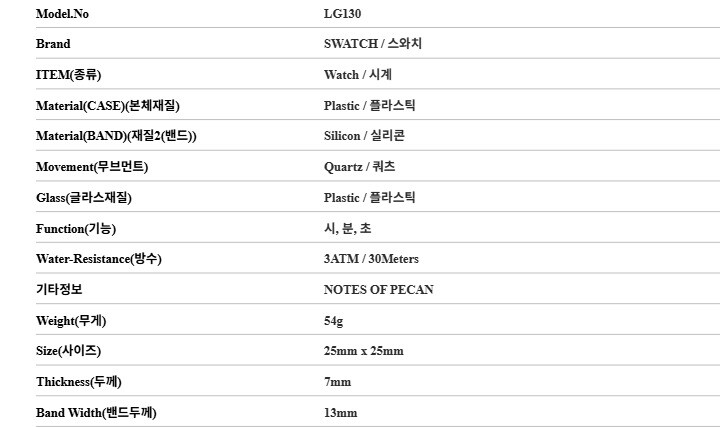 1. 소재 / 순도 / 밴드재질 | / 케이스 - 플라스틱 / 밴드 - 실리콘 |