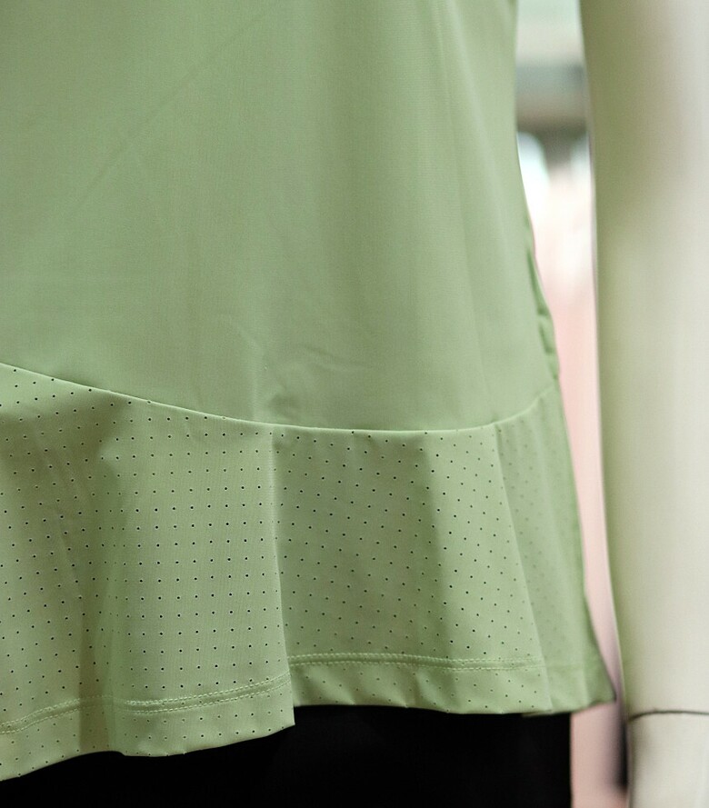 브이넥 카라와 밑단에 펀칭 원단의 플레어 디테일이