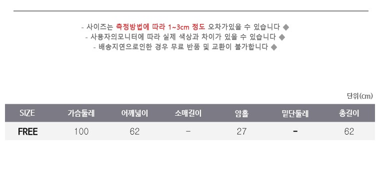 • 처음 배송된 상품상태와 다를 경우(세탁/착용 후 외출하신 경우) 반품이 불가합니다.