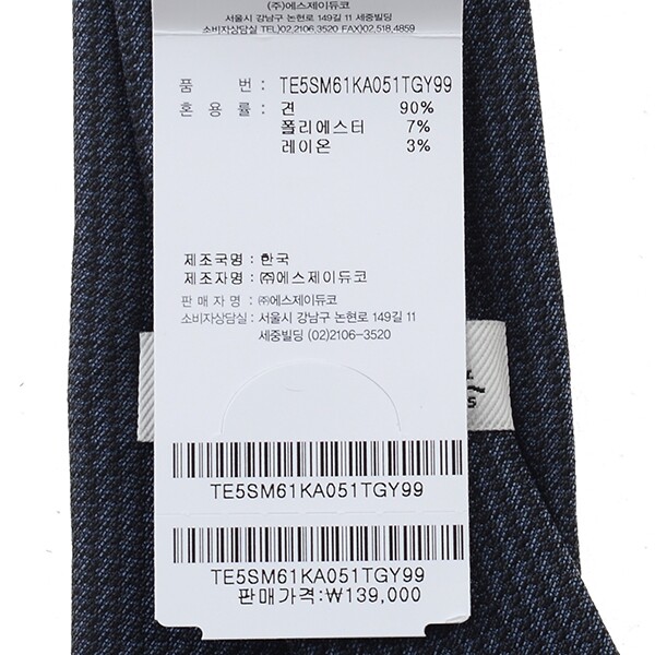 | 6. 취급시 주의사항 | -넥타이 보관시 매듭을 풀고 보관해 주십시요.-구김이 가지 않도록 길게 걸어두시는것이 좋습니다.-니트 타이의 경우, 장기간 걸어두시면 늘어날 수 있한국습니다. -둥글게 말아서 보관해 주십시요. - 접어서 보관하실 경우, 모양이 망가질 수 있으니 피해 주십시요.-물세탁시 제품의 광택 및 색상이 감소될 우려가 있습니다. -세탁시 사용시 모양이 망가질 수 있습니다 |