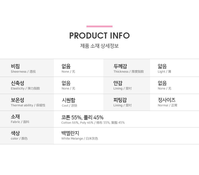| 1. 제품 소재 (섬유의 조성 또는 혼용률을 백분율로 표시, 기능성인 경우 성적서 또는 허가서) | 별도표시 |
