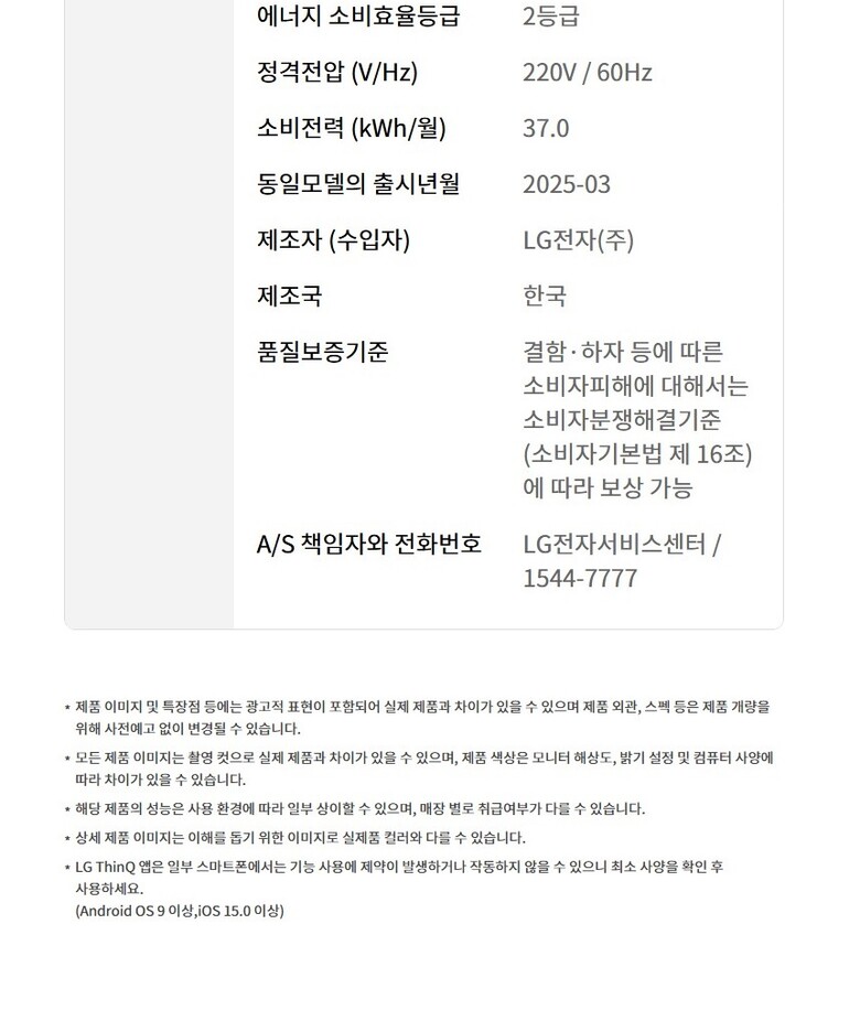 7. 정격전압,소비전력 220v 60Hz,37.0 kWh/월,2등급